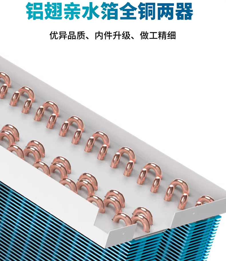 鋁翅親水膜 ,冷凝器/蒸發(fā)器,防污漬清潔能力,0.1mm親水鋁箔材料,快速冷凝,效率大幅度提升,內(nèi)螺紋銅管,大大提升了系統(tǒng)能效