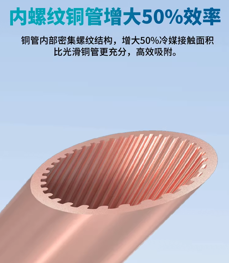 銅管內(nèi)部密集螺紋結構,增大50%冷媒接觸面積比光滑銅管更充分,高效吸附。加厚銅管,壁厚0.8(這里加粗),真材實料,使用壽命長,更適合復雜工況。
