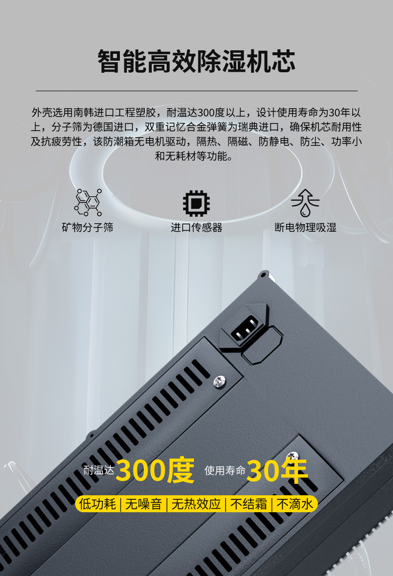 控濕機芯:外殼選用南韓工程塑膠,耐溫達(dá)300度以上,設(shè)計使用壽命為30年以上,分子篩為德國進(jìn)口,雙重記憶合金彈簧為瑞典進(jìn)口,確保機芯耐用性及抗疲勞性; 該防潮箱無電機驅(qū)動,隔熱﹑隔磁﹑防靜電﹑防塵﹑防盜﹑功率小和無耗材等功能,因此,該防潮箱具有環(huán)保﹑節(jié)能﹑靜音﹑無污染、不滴水。